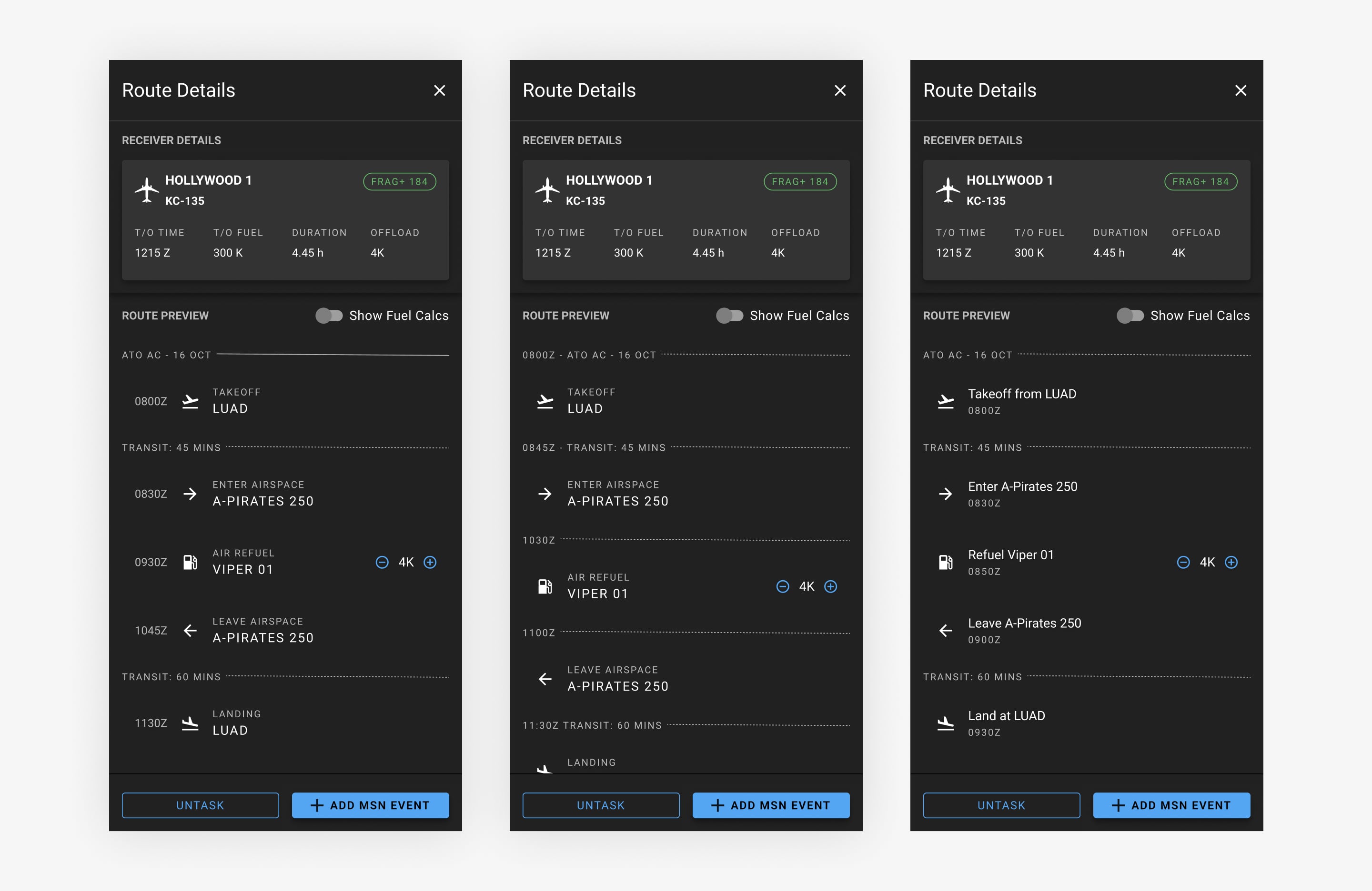 The updated Route Detail Drawer centralizes route information into a single, cohesive experience that supports faster validation and decision-making during mission planning. The redesign focused on improving clarity around mission events, particularly time, which research showed was frequently misunderstood in the previous subway-style representation.
